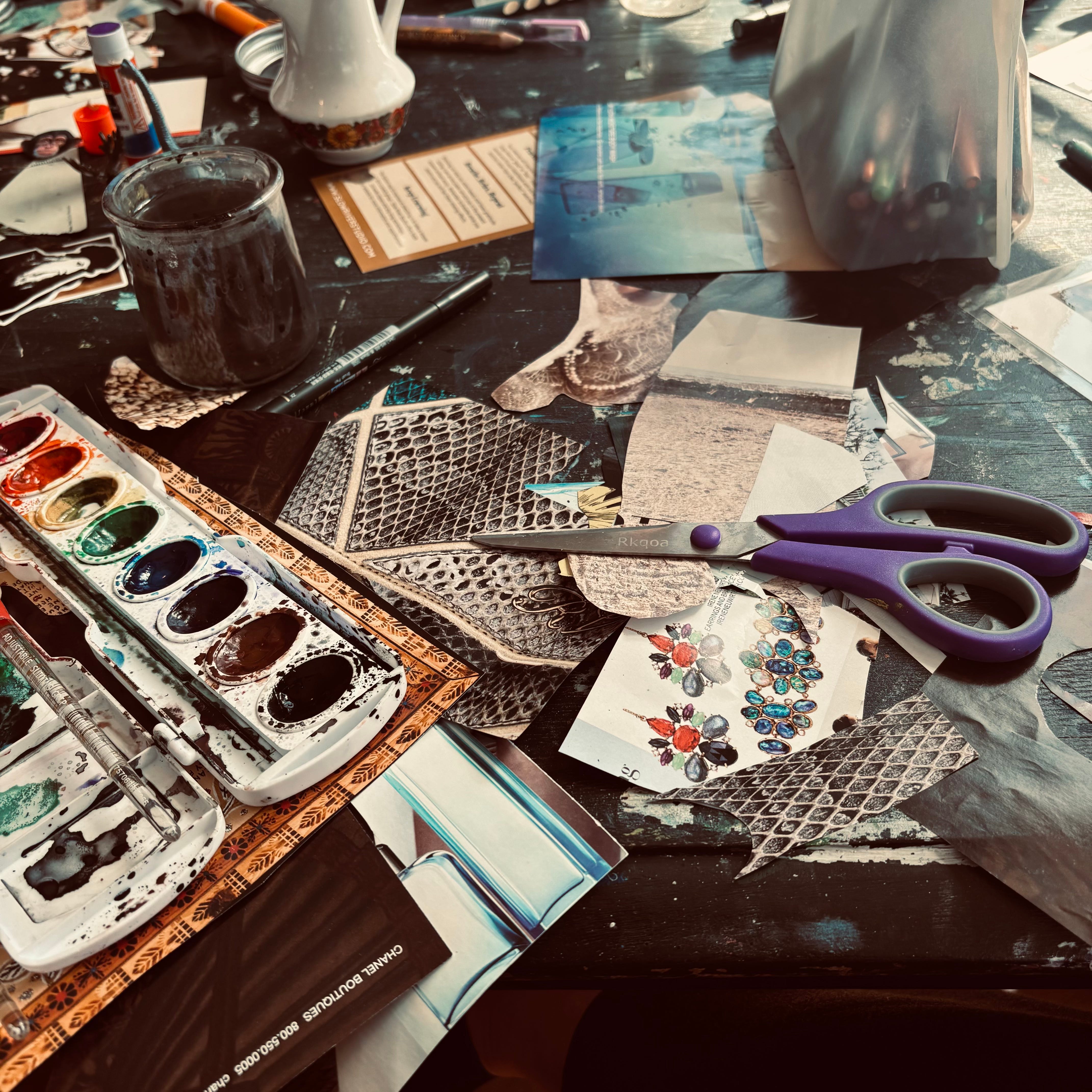 I did a couple of object sketches and filled them in with watercolors. Those were cheerful. Then I sketched a chalice, based on a real chalice, and tried to fill it with flowers, from my imagination. They looked terrible compared to the vase, and I painted black all over them, like in the Rolling Stones song. My friend suggested I make it into a collage.