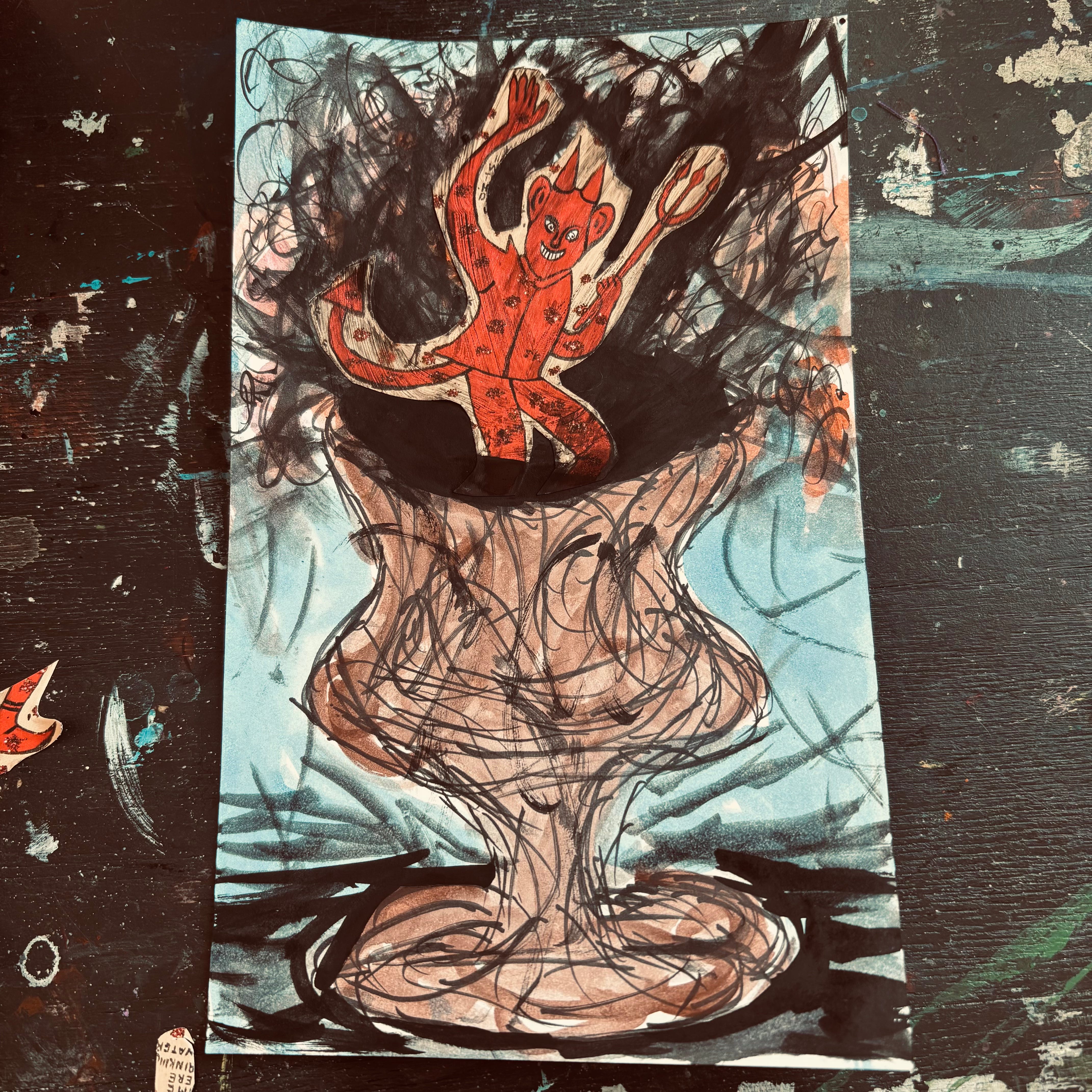 Right on top of the pile of available magazines was a cover filled with demons. Yes, that was it, that was what I wanted. That suited me better. So I cut out a demon and stuck him on with a glue stick. A little more black paint and it was perfect.