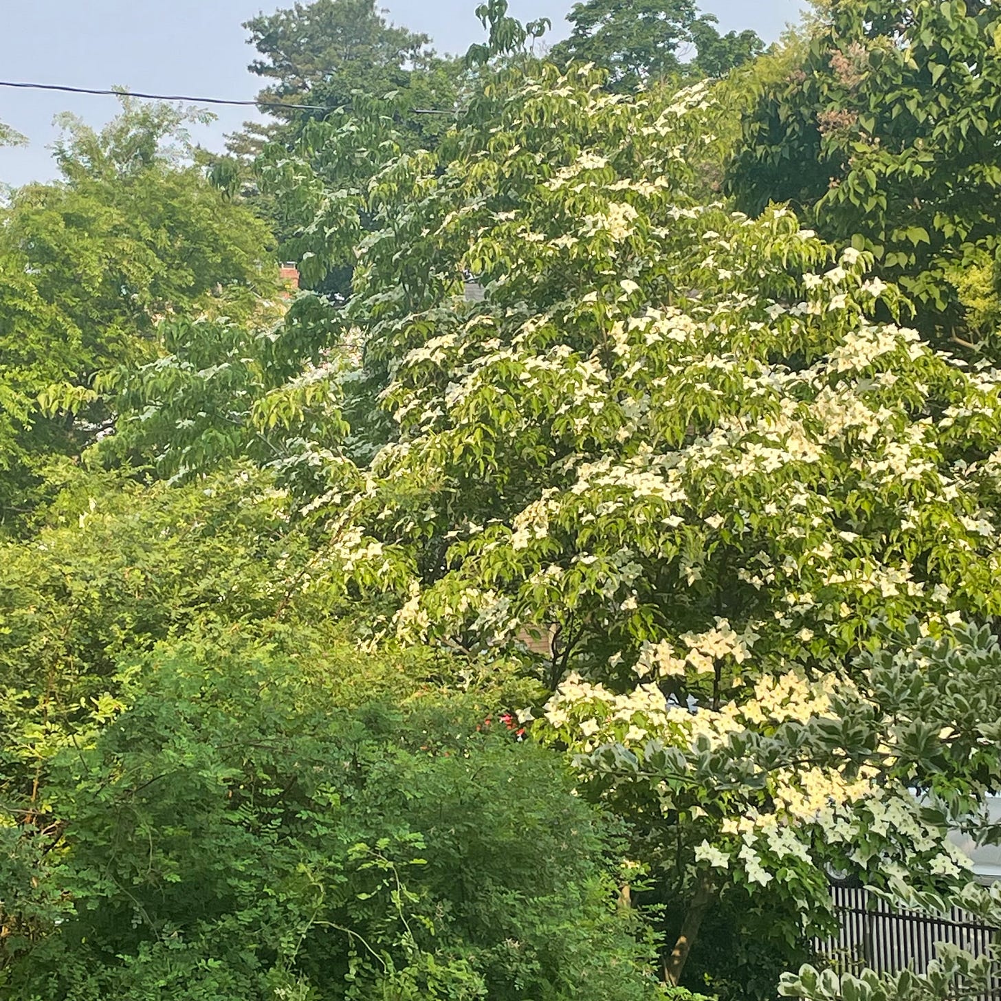 It’s hazy here today. Smoke from Canadian wildfires has blown into town, and I can smell it in the air. It gives light a more yellow tint than usual, different from a cloudy day. It’s been cloudy here the last few days, and that’s just gray. This is different.