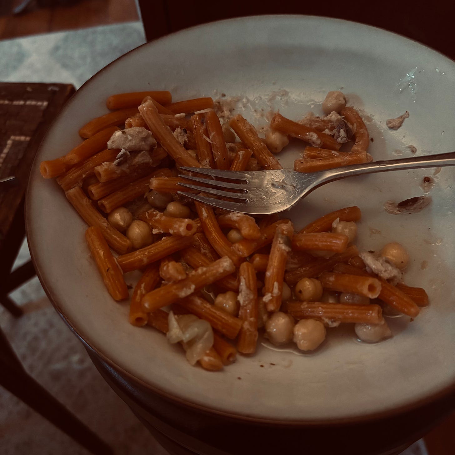 I took some of that terrible vanilla bean tuna salad from this morning, heated it up with wine, red pepper flakes, oregano. I cooked up some lentil pasta, added it to the pan, mixed it together. Not bad. The sugar in the yogurt caramelized a bit in the heat, making it a little more toasty than sweet. The van…